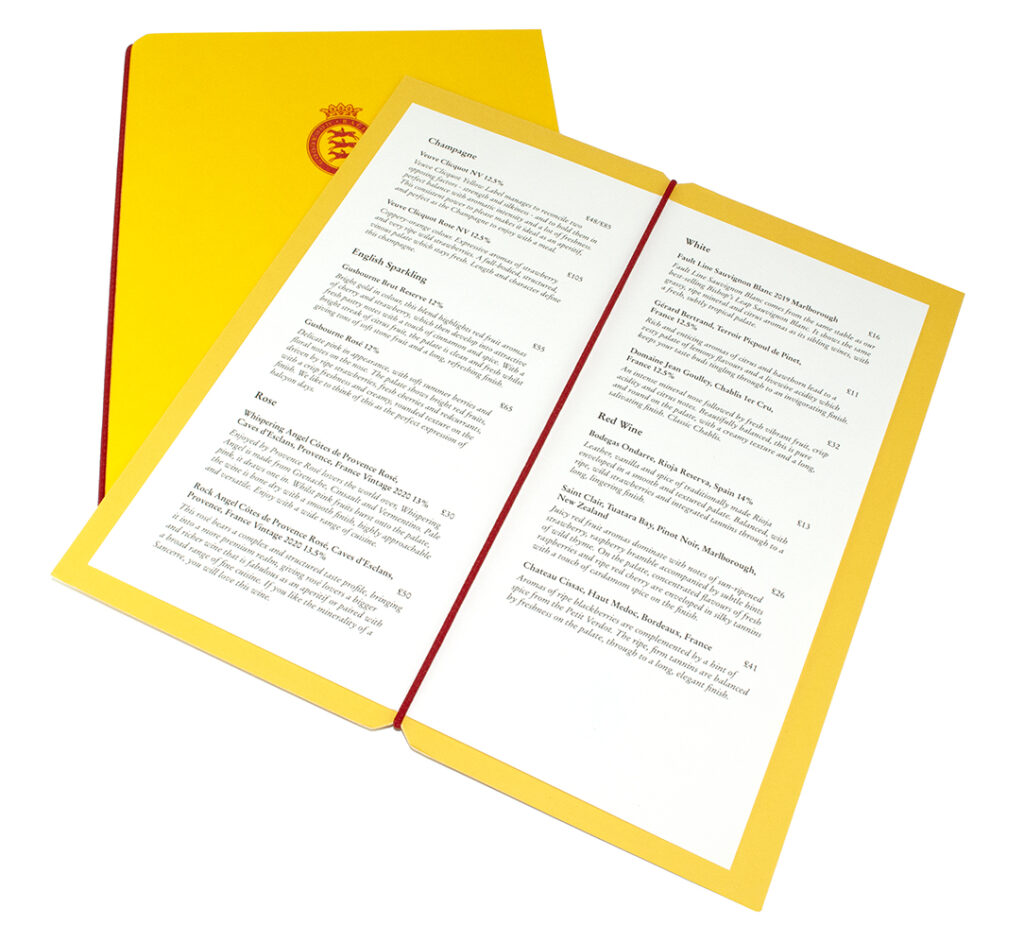 Printed in a custom-matched yellow ink that precisely reflects the client’s corporate colour, this striking menu and drinks list cover is minimal in its design but high on impact. The clean, understated print allows it to stand out while seamlessly fitting the client’s established brand identity.