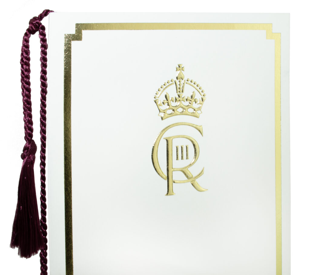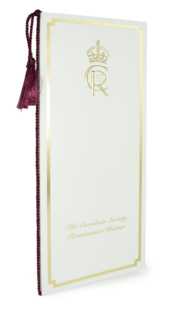 This elegant menu has been created from a cream colorplan card with detailed gold foil on the front and back of the cover. The inside pages are held in place with a knotted silk burgundy cord, complete with a stylish tassel