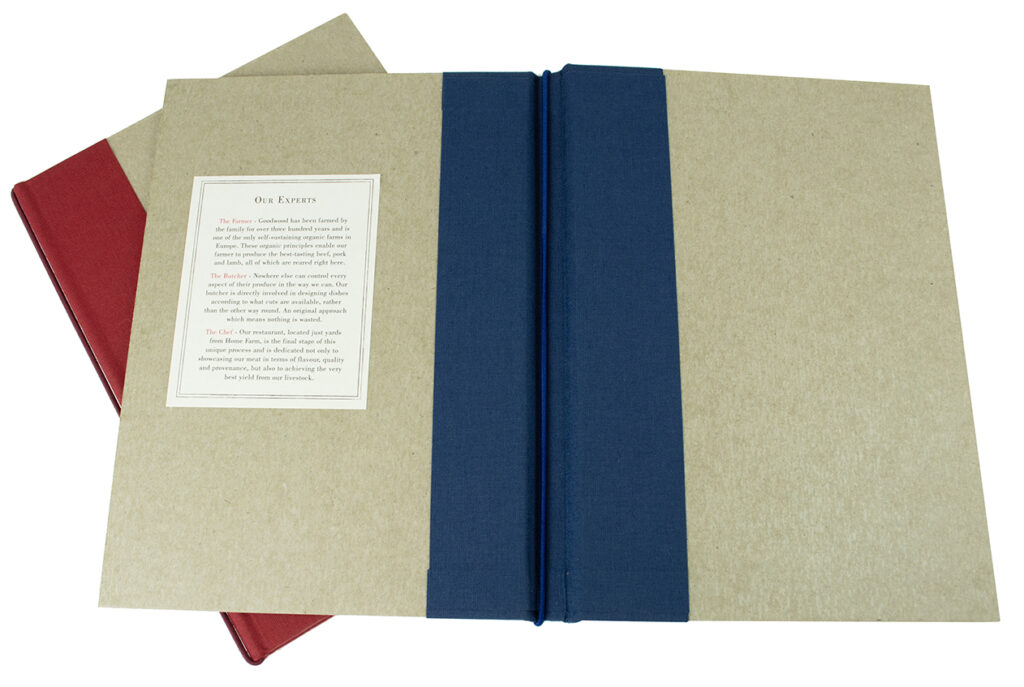 This is a three-piece menu cover which includes a small expanded section in the spine, allowing the cover to hold more pages within. The standard grey board has a great rustic look but with a soft touch lamination the board is both stain and water resistant. The blue binding cloth keeps the menu cover firmly held together, with a matching blue binding elastic to keep the pages in place. This style of menu allows the client to print their own inner sheets, giving the flexibility of changing the menu pages as often as required.